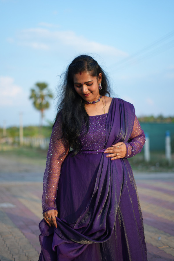 Launching exclusive party wear draping style gown outfit .This beautiful outfit made from premium space silk fabric with complete beads work on yoke part.